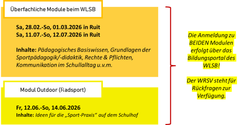 Die Qualifizierung wird im Blended-Learning-Format angeboten und startet im Sommer 2026. Die nachfolgenden Termine für die überfachlichen sowie radsportspezifischen Module können über das Bildungsportal des WLSB (hier klicken) gebucht werden!